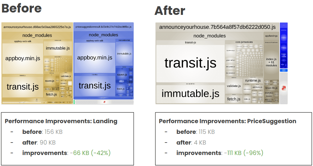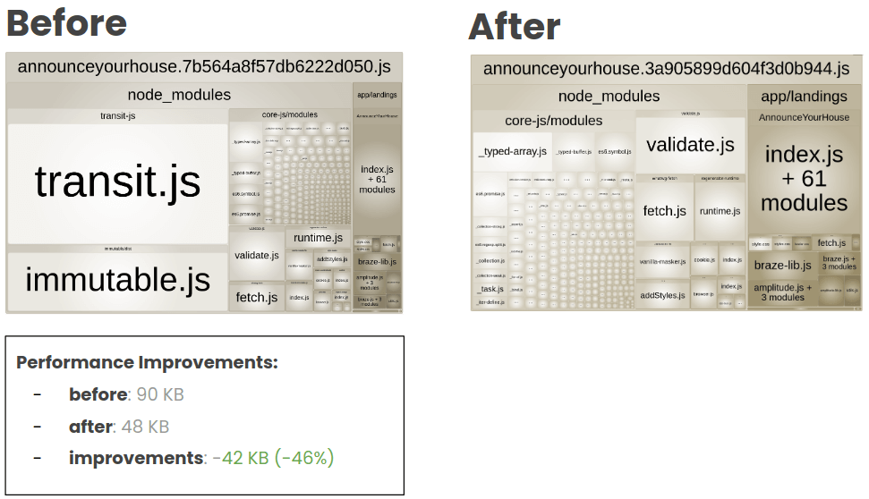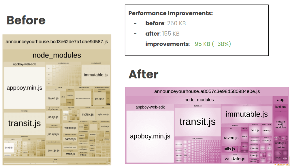 We reduced 95KB! It's interesting to think we can have a huge impact on a small change after carefully analyzing our bundles. This will be the process behind each improvement we did for the rest of this article: