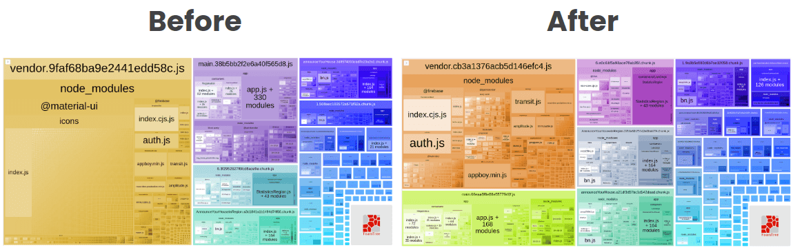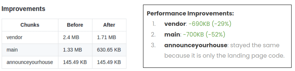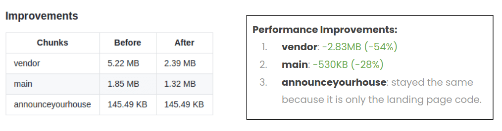 The result was huge. The main chunk got more than 50% smaller and the vendor chunk also decreased by 29%.