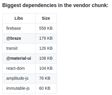 Our idea was to split these biggest dependencies in its own chunk and make sure the browser has a cached version of this chunk and the user doesn't need to download it again until it is needed.