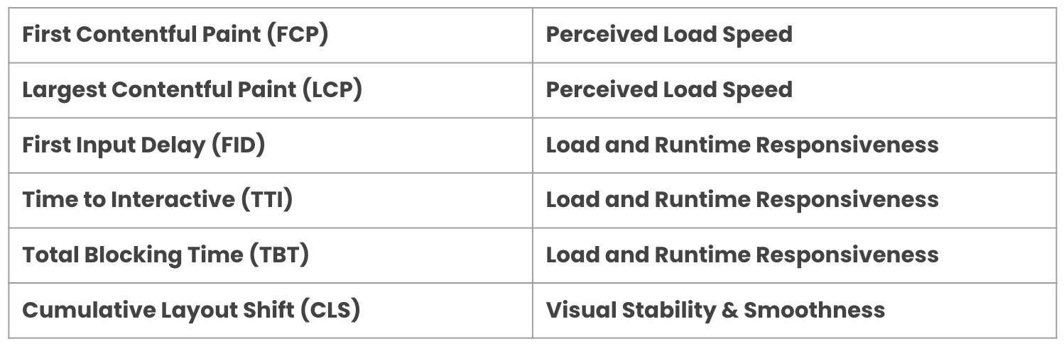 - Perceived load speed: how quickly a page can load and render all of its visual elements to the screen.