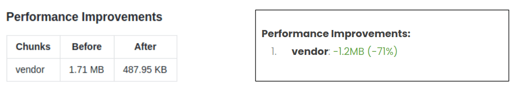 - Bundle Changes: shows the bundle size changes between the PR and the master (or main) branch. It helps us easily answer "did it increase/decrease the bundle size for X?"